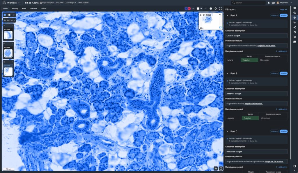 Using a dedicated OR view, surgeons can track pathologists’ progress in real-time and digitally receive frozen section reports.